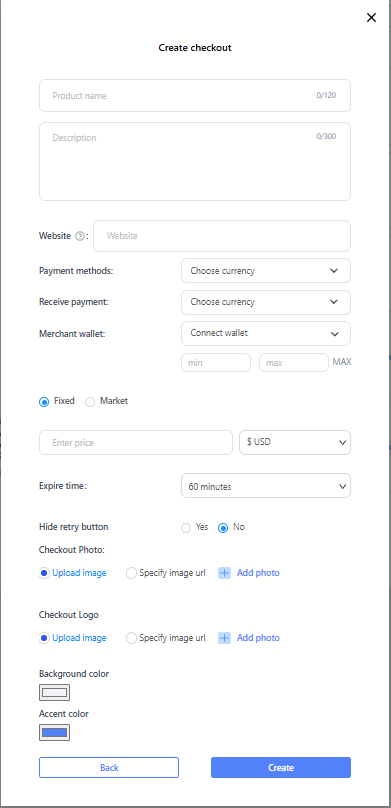 Max button - button to receive the maximum possible amount for sale. When receiving the amount, MinerFee and System Fee are taken into account, as well as already created checkouts based on the selected account wallet.